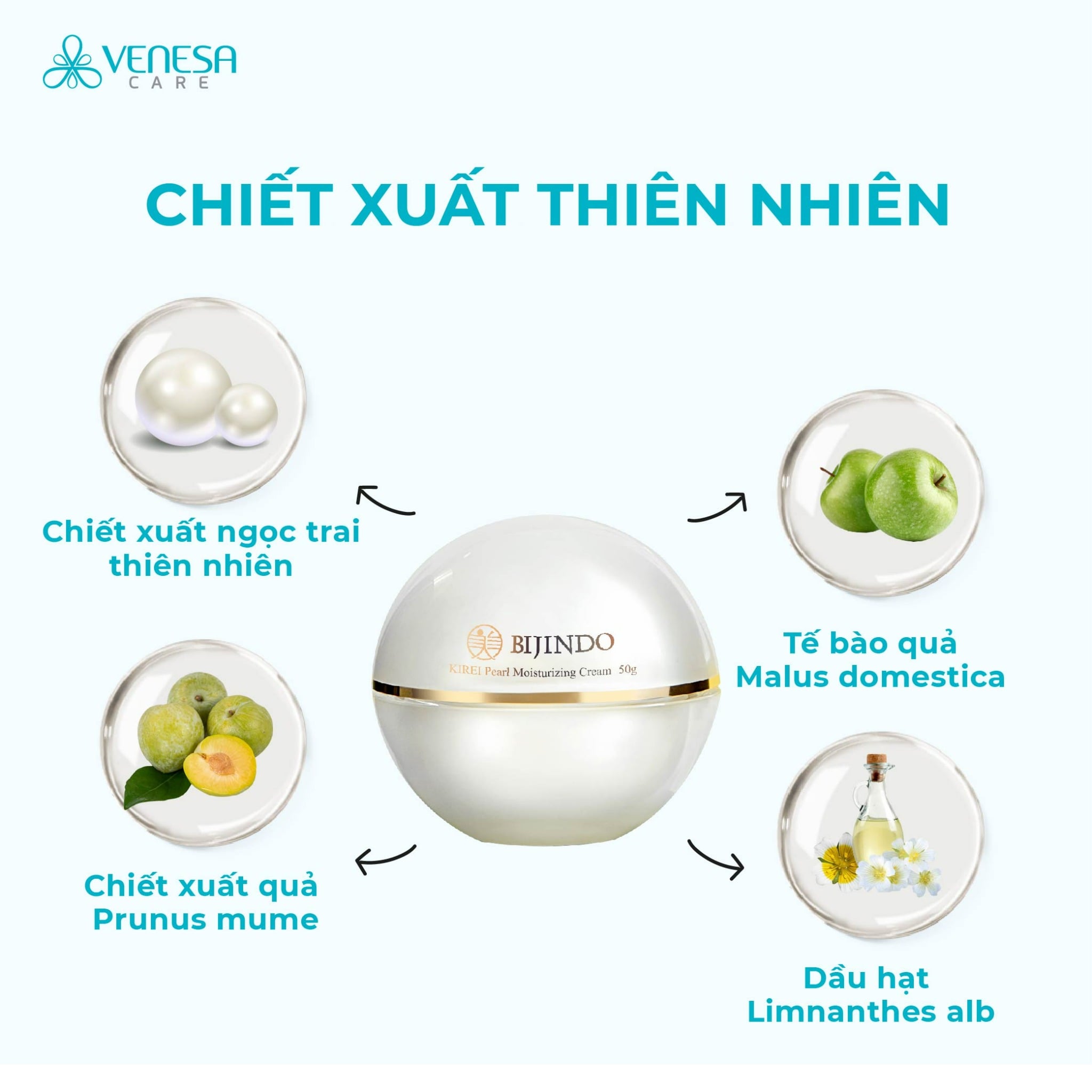 * Sản phẩm Kem dưỡng ẩm & trắng da ngọc trai Bijindo Kirei hiệu quả chứa thành phần thiên nhiên quý hiếm :